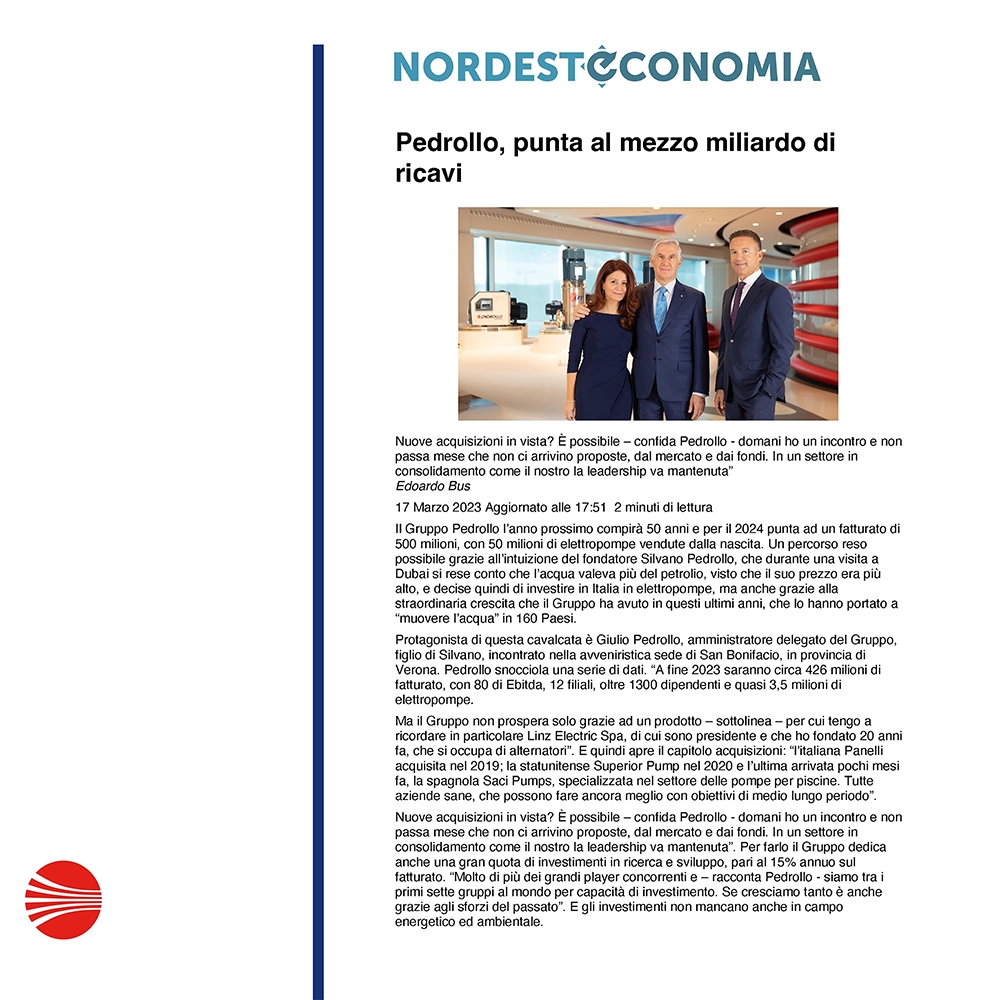 Pedrollo, aiming for half a billion in revenue.