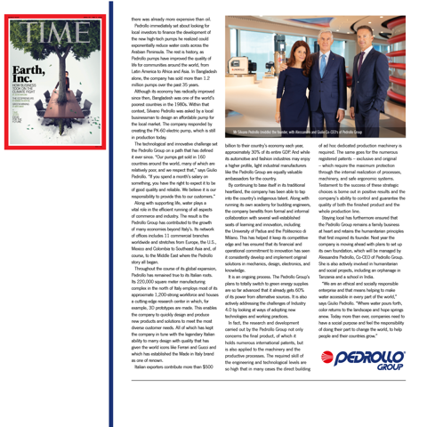 Giulio Pedrollo, CEO of Pedrollo SpA and Pedrollo Group, on Newsweek says “We represent “Made in Italy”, which is an efficient, beautiful product of high quality at the right price.” For almost 50 years Pedrollo has been expanding worldwide, and continues to design and build pumps that help carry water where it is needed most, including to homes, agricultural fields or industrial facilities. “Treating water with respect is the best way of understanding our group. We want to respect water, which means a lot of things in relation to our products: including using stainless steel, better materials, and overall how we produce water pumps.”